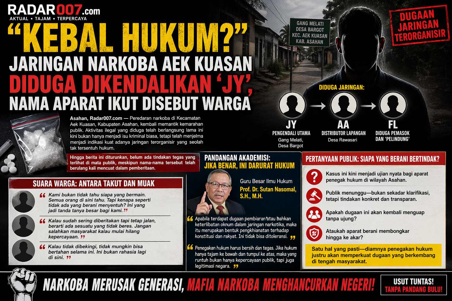 Peredaran narkoba di Kecamatan Aek Kuasan, Kabupaten Asahan, kembali menjadi sorotan tajam publik. Aktivitas ilegal yang disebut-sebut telah berlangsung lama ini kini memunculkan dugaan adanya jaringan terorganisir yang seolah kebal hukum.