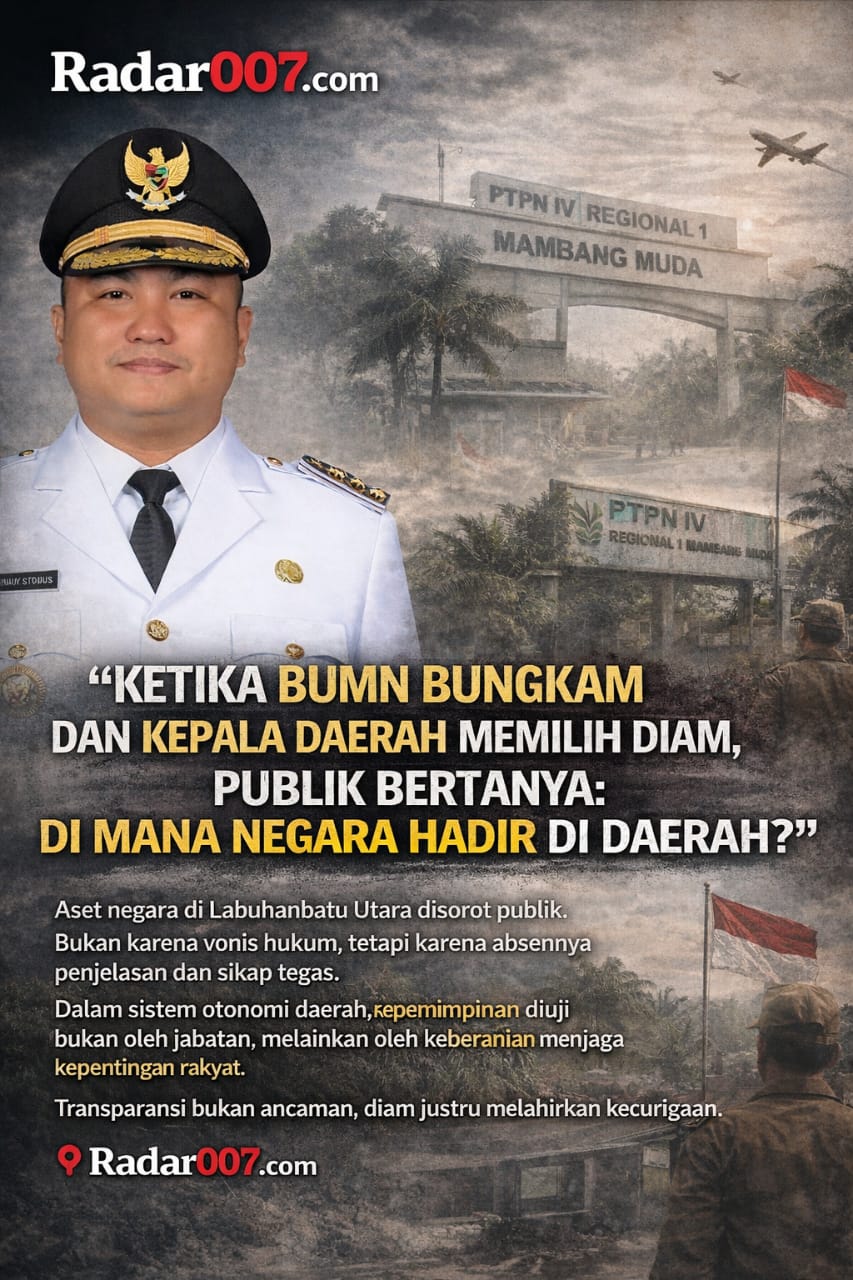 Labura, Radar007.com – Berlarutnya sikap bungkam PTPN IV Regional 1 Mambang Muda–Labuhanhaji dan manajemen PTPN IV Sumatera Utara kini tidak hanya menyeret isu tata kelola BUMN, tetapi juga menyerempet langsung pada kepemimpinan Bupati Labuhanbatu Utara (Labura), Hendriyanto Sitorus, S.E., M.M. Publik menilai, diamnya kepala daerah dalam polemik aset negara tersebut mencerminkan lemahnya pemahaman dan penggunaan kewenangan strategis yang melekat dalam sistem desentralisasi dan otonomi daerah.