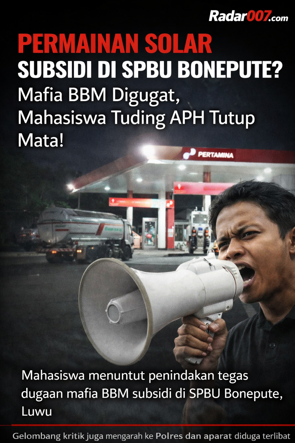 Luwu, Radar007.com — Dugaan penyelewengan Bahan Bakar Minyak (BBM) bersubsidi kembali mencuat dan memicu kemarahan publik di Kabupaten Luwu, Sulawesi Selatan. Aktivitas ilegal yang dikenal dengan istilah “pengangsuan solar” diduga masih berlangsung hingga kini dan disebut-sebut terjadi di SPBU Bonepute, Kecamatan Larompong Selatan.