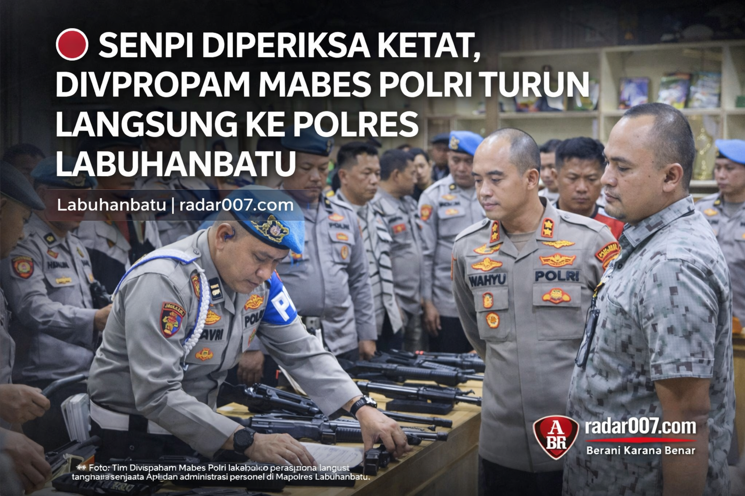 Suasana serius terlihat di Mapolres Labuhanbatu saat Tim Divisi Profesi dan Pengamanan (Divpropam) Mabes Polri bersama Slog Mabes Polri melakukan pemeriksaan menyeluruh terhadap senjata api (senpi) dinas, Jumat (17/4/2026).