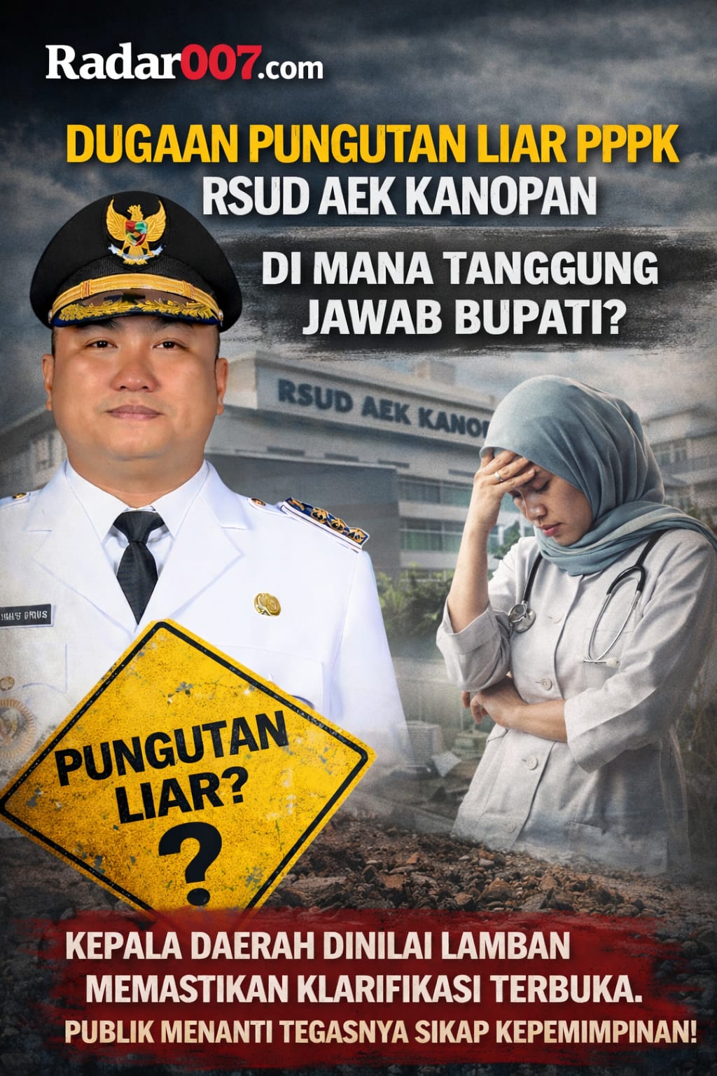 Labura, Radar007.com — Dugaan pungutan liar PPPK Paruh Waktu di RSUD Aek Kanopan kini telah bergeser dari sekadar isu administratif menjadi ujian serius atas kepemimpinan Bupati Labuhanbatu Utara (Labura), Hendriyanto Sitorus, S.E., M.M. Di tengah kegelisahan tenaga honorer dan sorotan publik yang kian menguat, sikap kepala daerah dinilai belum mencerminkan keberanian politik untuk menghadirkan kejelasan dan kepastian.