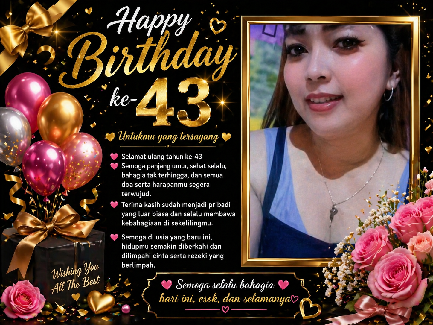 “Selamat ulang tahun ke-43, semoga setiap langkahmu selalu dimudahkan, semua doa terwujud, dan kebahagiaan selalu menyertaimu hari ini, esok, dan selamanya.”