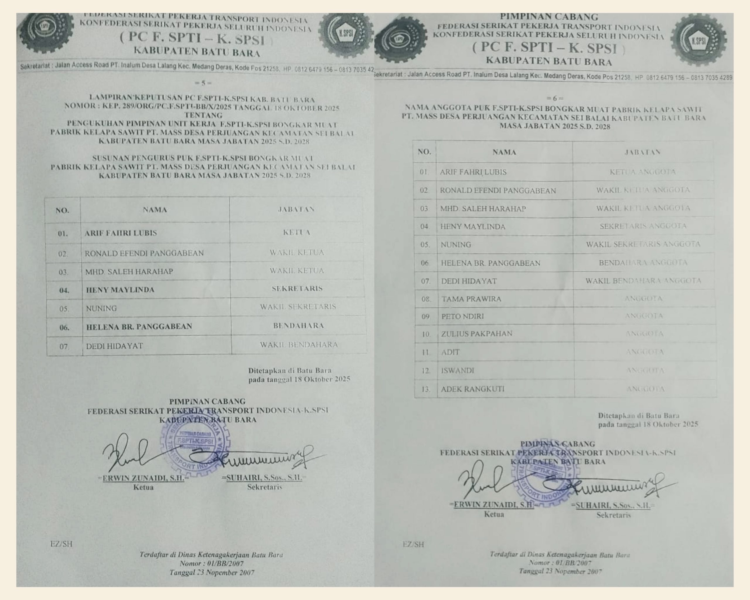 Batu Bara, Radar007.com — Ketua Federasi Serikat Pekerja Transport Indonesia – Konfederasi Serikat Pekerja Seluruh Indonesia (F.SPTI-K.SPSI) Kabupaten Batu Bara, Erwin, menegaskan bahwa proses pemberhentian dan pengangkatan pengurus di tingkat unit kerja (PUK) telah dilakukan sesuai dengan Anggaran Dasar dan Anggaran Rumah Tangga (AD/ART) organisasi serta Standar Operasional Prosedur (SOP) yang berlaku.