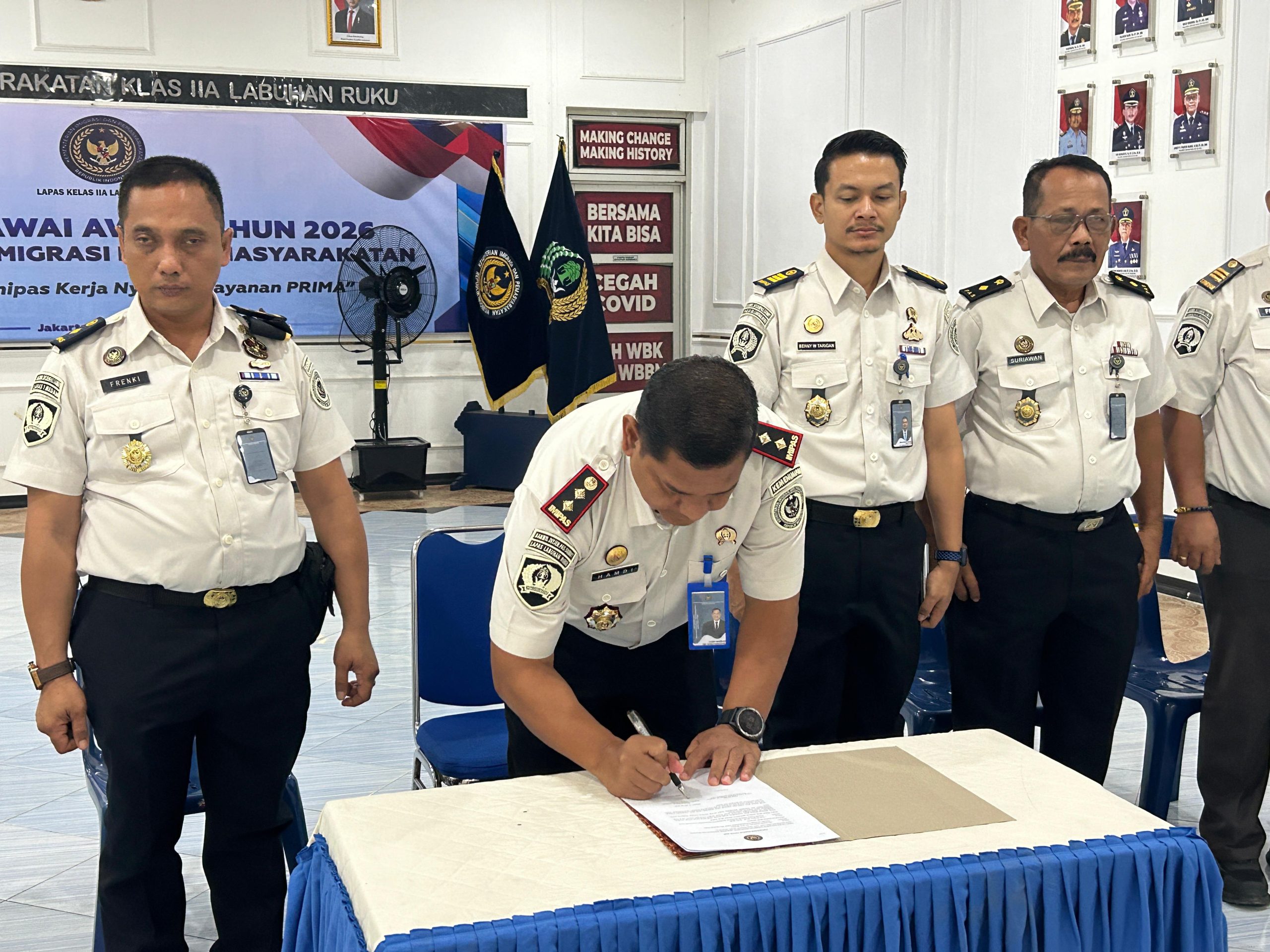 Kegiatan penandatanganan perjanjian kinerja tersebut diikuti oleh Kepala Lapas Labuhan Ruku, Hamdi Hasibuan, bersama pejabat struktural di Aula Lapas Labuhan Ruku. Seluruh rangkaian kegiatan diikuti dengan khidmat sebagai wujud keseriusan dalam menyukseskan target dan program kerja tahun 2026.