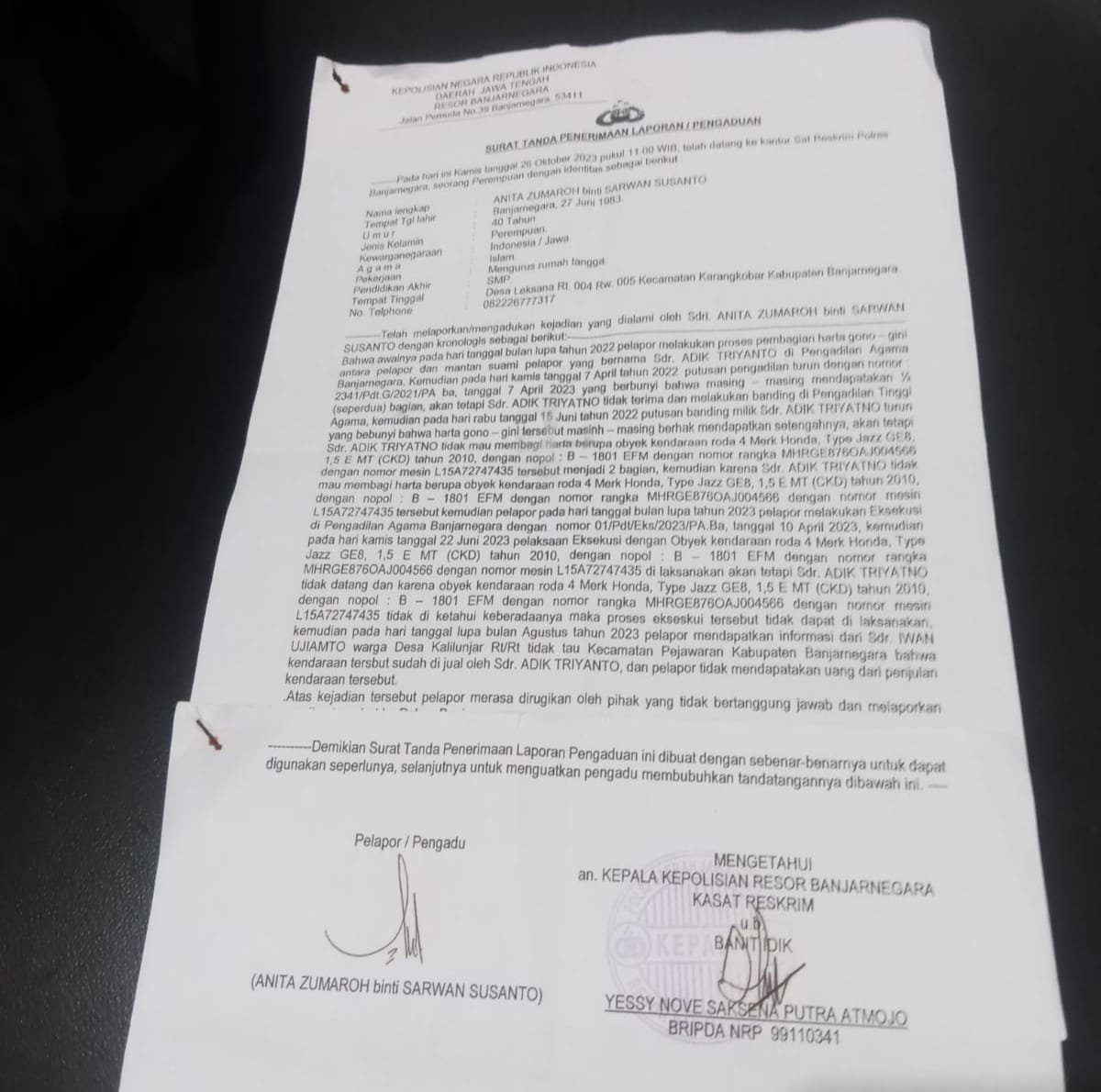 Beberapa waktu tiga tahunan setelah cerai dan gugat gono gini 26 Oktober 2025, lalu, Anita Zumaroh melaporkan Adik Pritatno ke Polres Banjarnegara Polda Jateng atas dugaan penggelapan mobil.