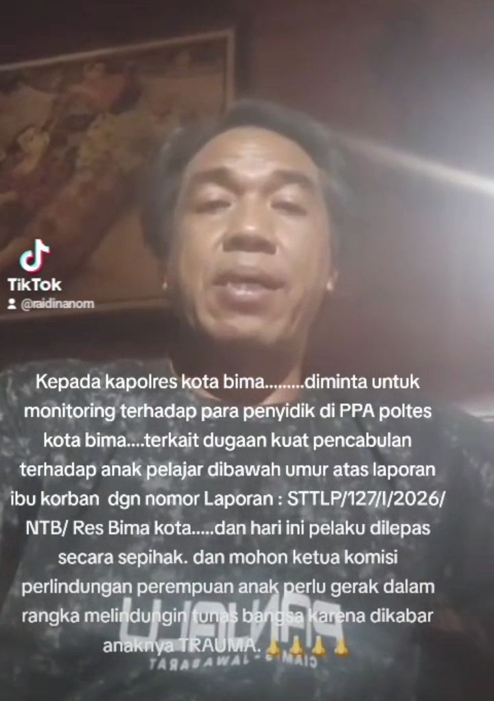 Perkara tersebut dilaporkan oleh ibu korban dengan nomor laporan STTLP/127/I/2026/NTB/Res Bima Kota, yang saat ini menjadi perhatian publik setelah beredarnya sebuah video pernyataan Raidin Anom di berbagai platform media sosial (medsos).