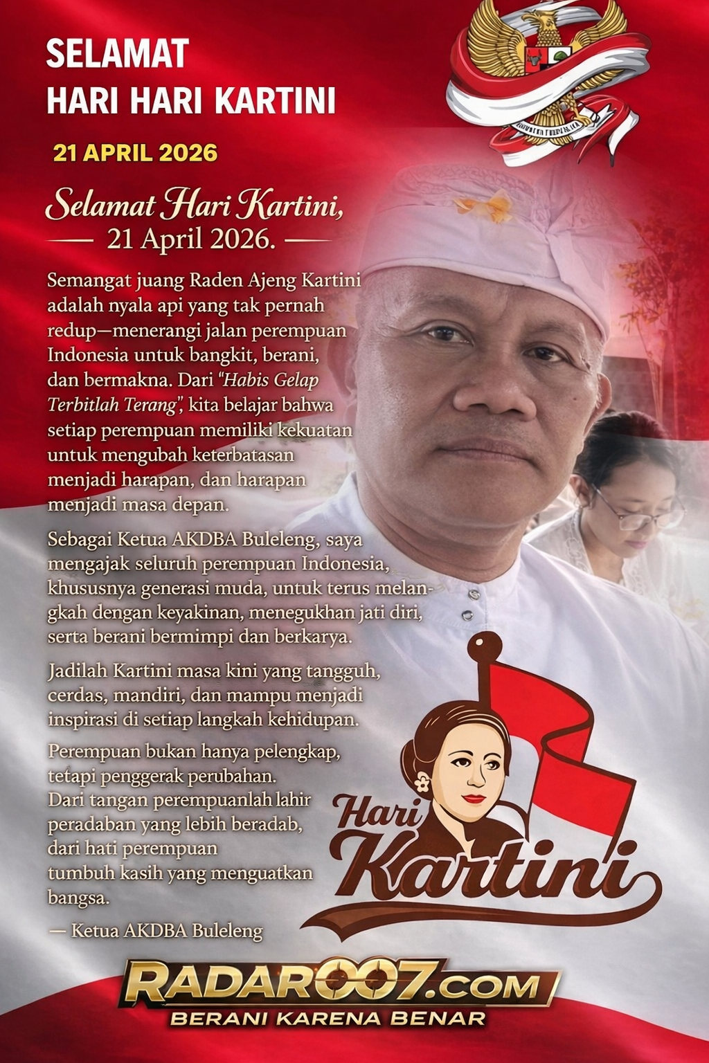 Sebagai Ketua AKDBA (Arya Kepakisan Dauh Baleagung) Buleleng, saya mengajak seluruh perempuan Indonesia, khususnya generasi muda, untuk terus melangkah dengan keyakinan, meneguhkan jati diri, serta berani bermimpi dan berkarya. Jadilah Kartini masa kini yang tangguh, cerdas, mandiri, dan mampu menjadi inspirasi di setiap langkah kehidupan.