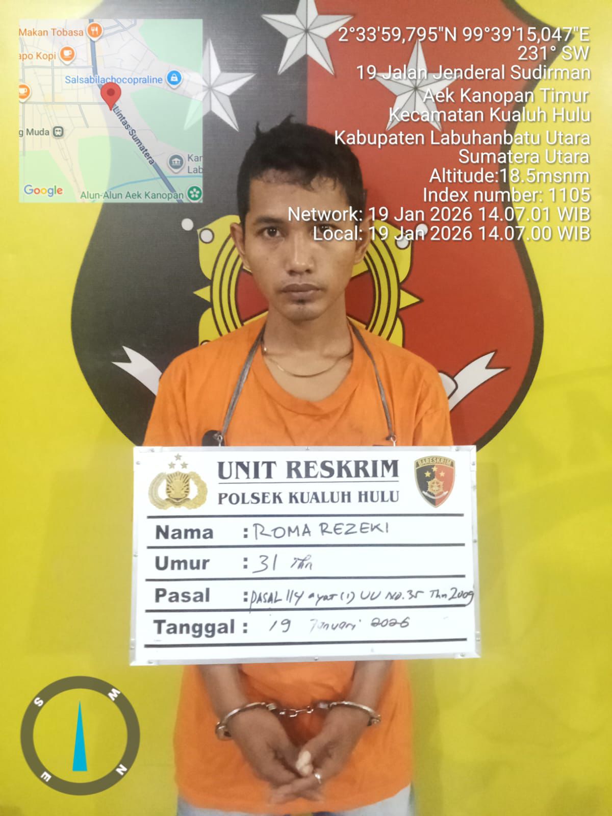 “Tersangka kami jerat dengan pasal-pasal dalam Undang-Undang Narkotika. Saat ini yang bersangkutan bersama barang bukti telah diamankan di Polsek Kualuh Hulu untuk proses penyidikan lebih lanjut,” tegas Kapolsek.