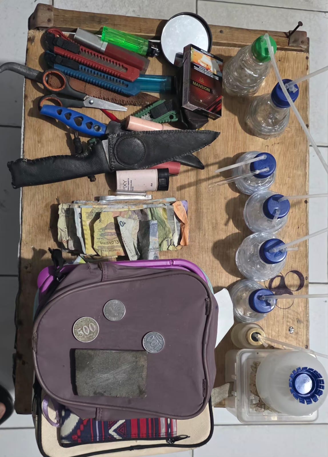 Dari lokasi penindakan, petugas mengamankan sejumlah barang bukti, di antaranya: 7 buah alat hisap sabu (bong), 2 buah dompet kecil berisi kaca pirex, 5 buah pisau, 1 buah gunting, 1 buah tas kecil, 3 buah toples plastik, dan Uang tunai sebesar Rp166.000.